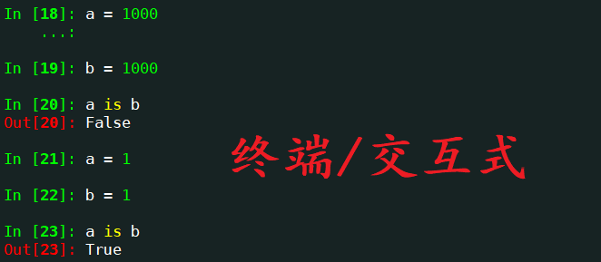 大整数对象池。说明:终端是每次执行一次,所以每次的大整数都重新创建,而在pycharm中,每次运行是所有代码都加载都内存中,属于一个整体,所以这个时候会有一个大整数对象池,即处于一个代码块的大整数是同一个对象。