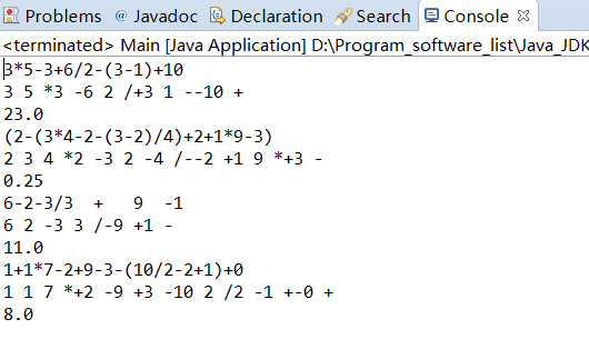 | public static void main(String[] args) { String a = "3*5-3+6/2-(3-1)+10"; System.out.println(a); StringBuffer b = toPostfix(a); System.out.println(b); System.out.println(toValue(b)); a = "(2-(3*4-2-(3-2)/4)+2+1*9-3)"; System.out.println(a); b = toPostfix(a); System.out.println(b); System.out.println(toValue(b)); a = "6-2-3/3 + 9 -1"; System.out.println(a); b = toPostfix(a); System.out.println(b); System.out.println(toValue(b)); a = "1+1*7-2+9-3-(10/2-2+1)+0"; System.out.println(a); b = toPostfix(a); System.out.println(b); System.out.println(toValue(b)); }