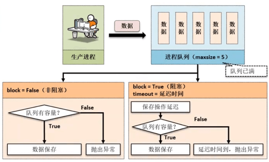 block=False: 描述的是采用非阻塞的形式运行,如果发现队列中的数据已经满了,或者队列中还没有任何数据的时候,那么就会直接抛出异常。