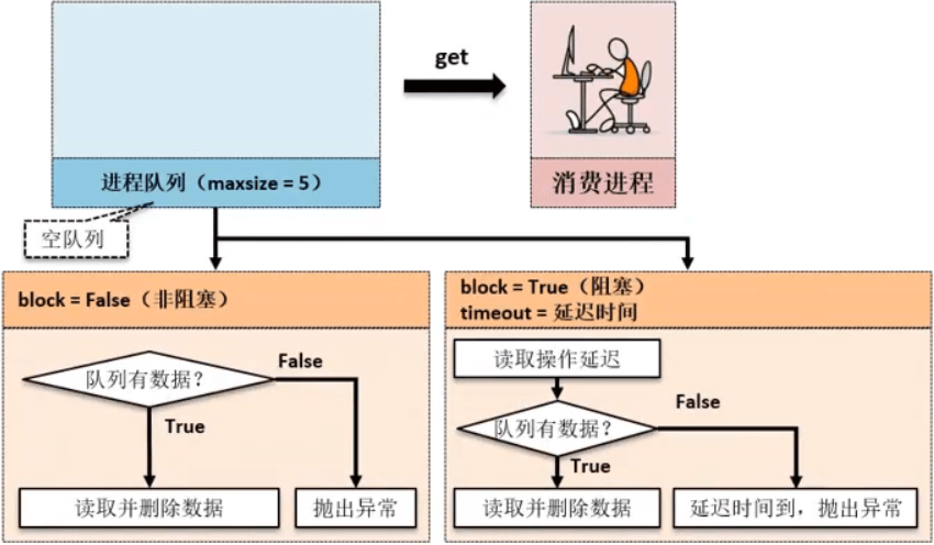 | 3 | get(self,block=True,timeout=None) | 方法 | 从队列获取数据,block为队列为空时的阻塞配置(默认为True),timeout为阻塞超时时间(单位为“秒”) |