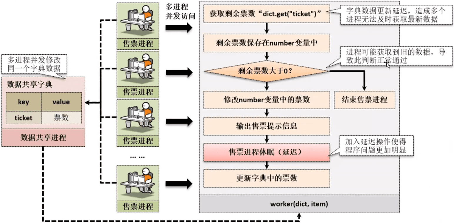 注:由于在余票判断和售票以及更新票数之间无论怎样都会存在时间延迟,而且各个进程之间的各个步骤都是平等的,由操作系统决定如何执行,所以三个步骤是可分的,并且多个进程的各个步骤相互交叉,变得不可控,一个进程判断可以售票,所以去售第五张票,由于还未更新数据,其它进程也都进入了售第五张票的状态,所以一张票被卖了好几次,如上,客户肯定不买这样的帐。。