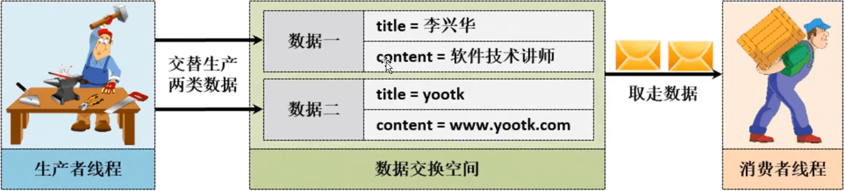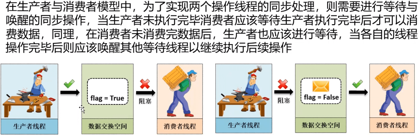 - 如果现在生产者发现数据没有被消费者消费,则生产者需要等待,而后当消费者把数据取走之后再进行生产;