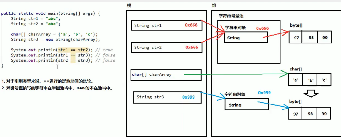 public boolean equals(Object obj): 参数可以是任何对象,只有参数是一个字符串并且内容相同才会给true,否则返回false