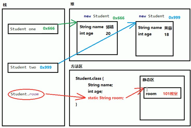 - 如果没有static关键字,那么必须首先创建对象,然后通过对象才能使用它。